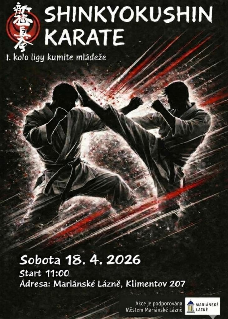 TJ Lokomotiva Mariánské Lázně pořádá 20. ročník Ligy kumite mládeže v karate, který proběhne v sobotu 18. dubna 2026. Akce se koná v Klimentově 207, kde se uskuteční prezentace a vážení závodníků.